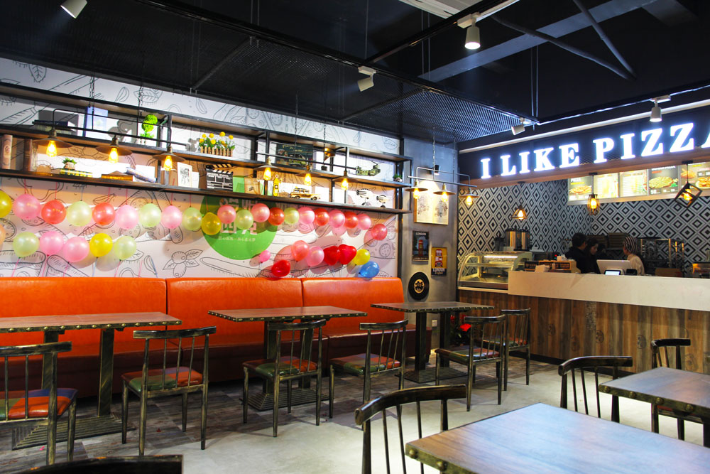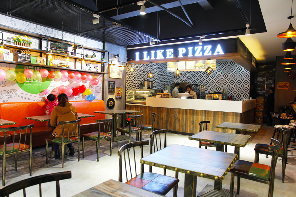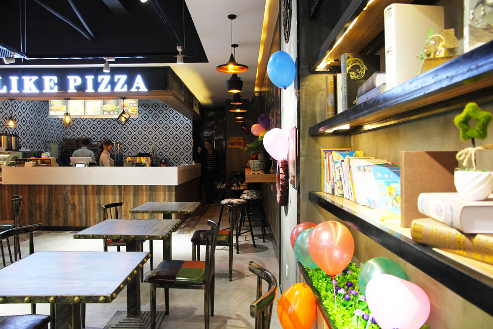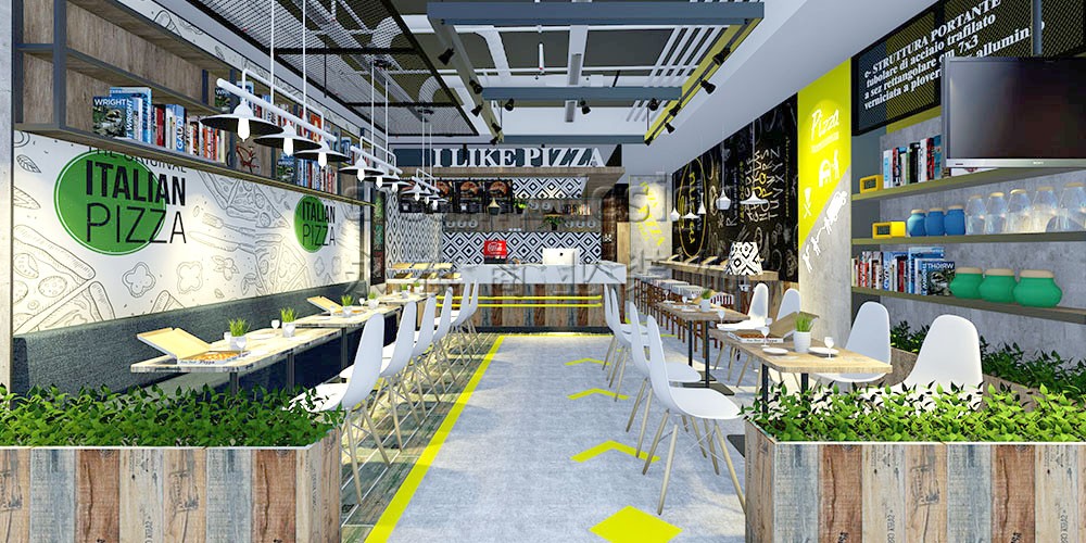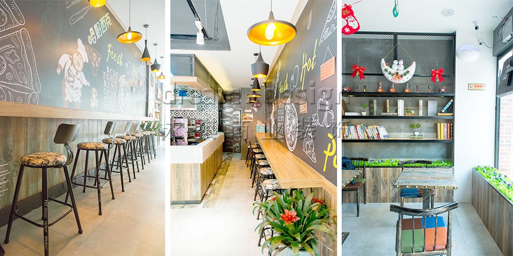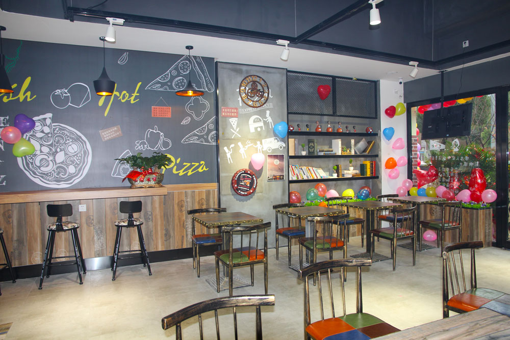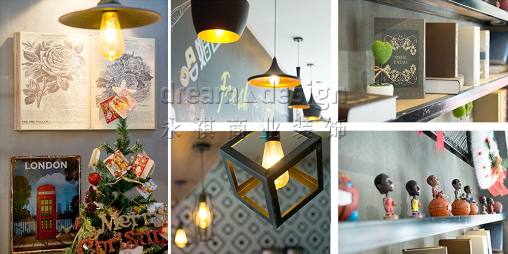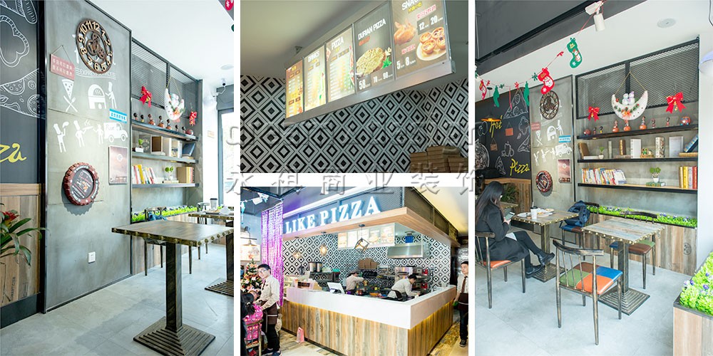 永祺商裝采用現(xiàn)今流行的LOFT風(fēng)格來打造哈姆西克的空間設(shè)計,既先鋒前衛(wèi),又極具藝術(shù)家夢幻氣質(zhì),并巧用披薩元素,起到畫龍點睛的作用,從門頭吸睛的披薩個性造型,到店內(nèi)的披薩墻面趣圖,良好詮釋了整體協(xié)調(diào)性;鋼木結(jié)構(gòu)、異形燈具、裝飾鐵架,簡潔的線條有力勾勒出全局;暖色燈光投射在灰色基調(diào)的披薩樂園中,讓食客在歡暢的心情下大快朵頤。