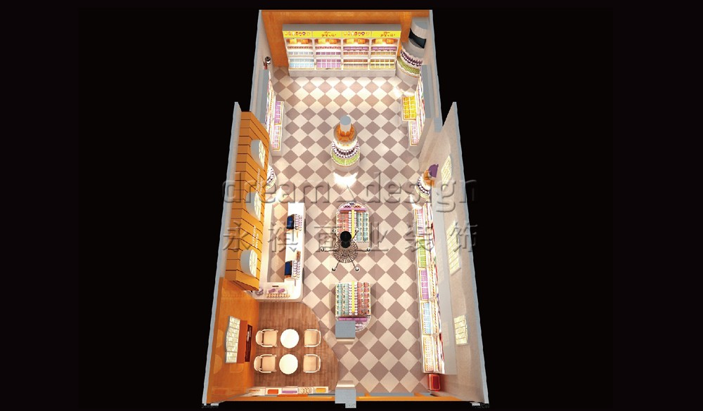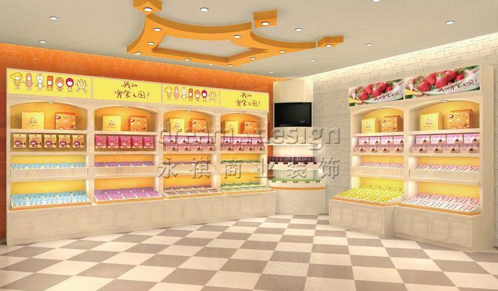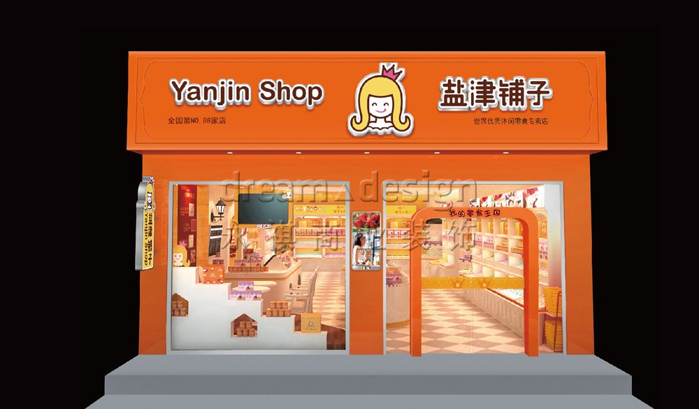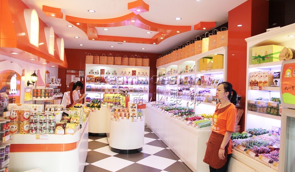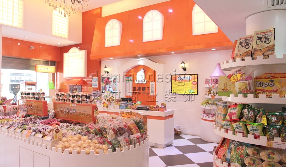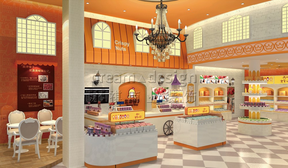 整個(gè)空間設(shè)計(jì)圍繞「我的零食王國(guó)」主題綻開,以活躍橙為主色調(diào),黑白菱形格做鋪墊,天花--頭頂著公主王冠,配合童話里的水晶吊燈,格林童話里的小窗戶,讓每一位進(jìn)店的消費(fèi)者體驗(yàn)到童話般的購(gòu)物環(huán)境與女王般的待遇。