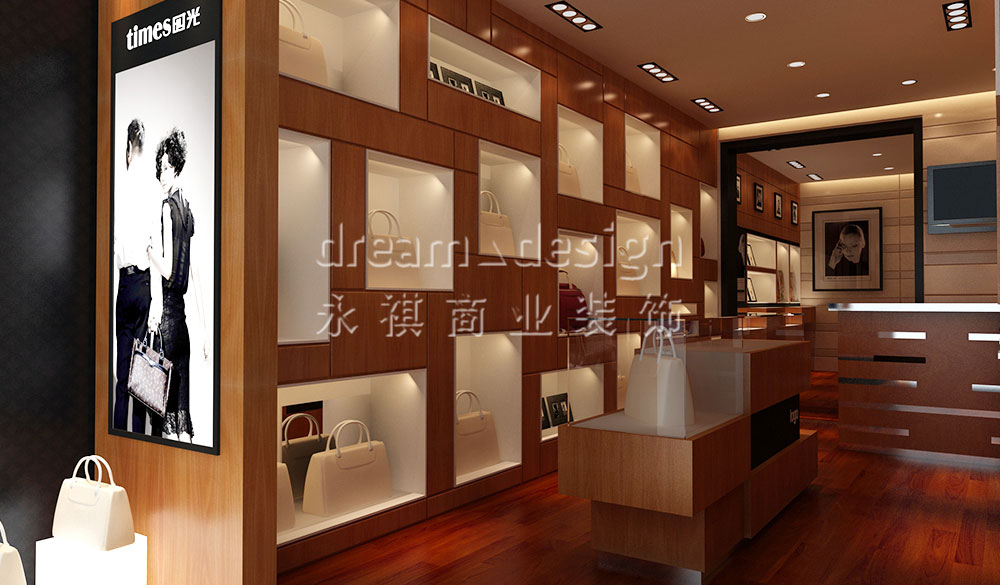 營造的溫馨氣氛激活人的藝術(shù)細(xì)胞使之變得對美更加敏感,陳列臺的設(shè)計融合了現(xiàn)代風(fēng)格跟古典美,在跟溫暖的燈光交織下將TIMES時光的包包展現(xiàn)的淋漓盡致。