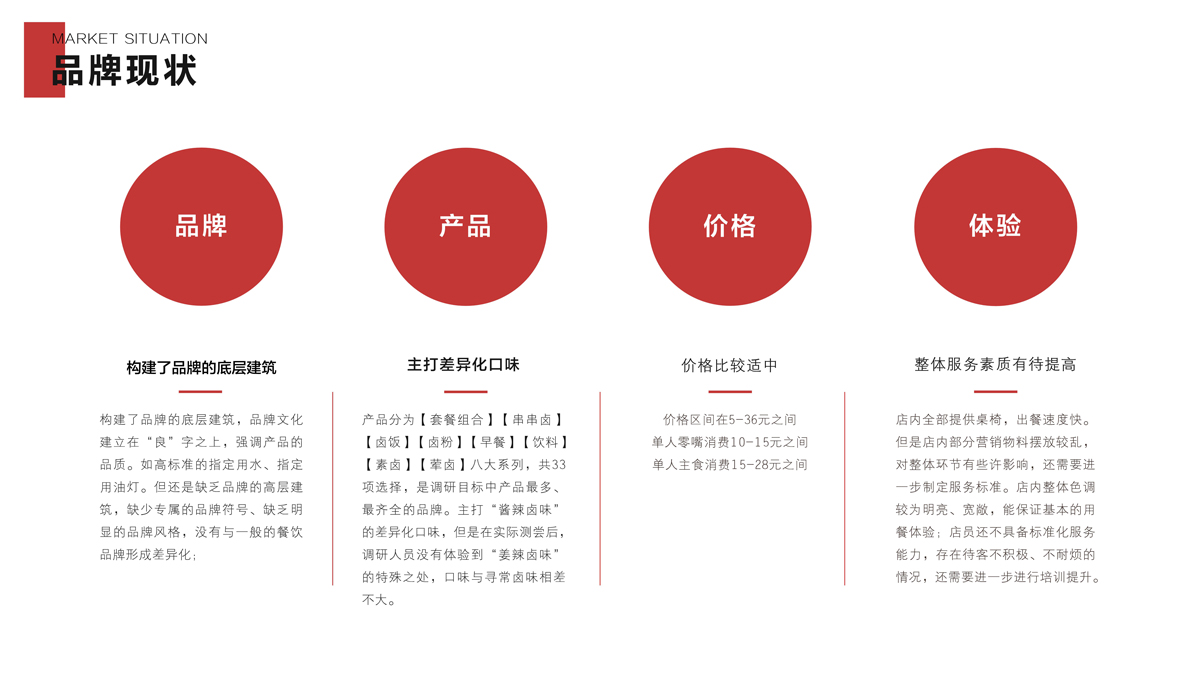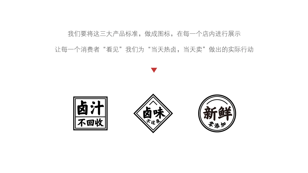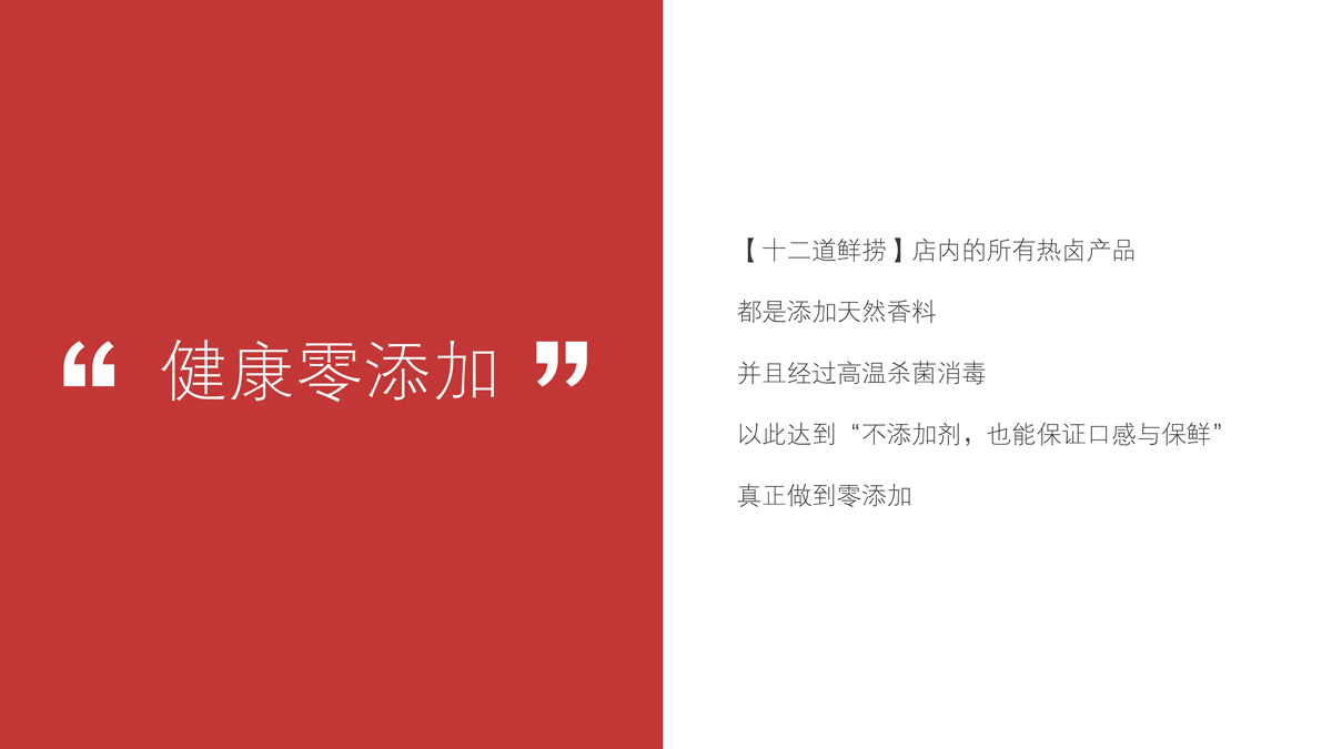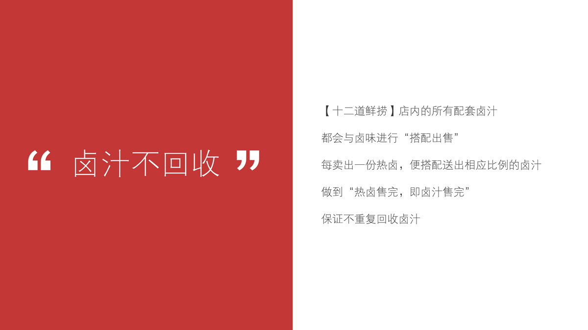 通過(guò)調(diào)研與分析,可以發(fā)現(xiàn),長(zhǎng)沙雖然不缺乏熱鹵產(chǎn)品與品牌,但是多數(shù)品牌的發(fā)展尚處于起步階段,產(chǎn)品同質(zhì)化非常嚴(yán)重,品牌定位模糊,真正優(yōu)秀的品牌尚未出現(xiàn)。我們將【十二道鮮撈】定位為:每日鮮鹵,重點(diǎn)突出“鮮”,建立產(chǎn)品差異化。根據(jù)“當(dāng)天熱鹵,當(dāng)天賣(mài)”的口號(hào),我們?yōu)椤臼栗r撈】制定了三大產(chǎn)品標(biāo)準(zhǔn):鹵味不過(guò)夜、鹵汁不回收、新鮮零添加。