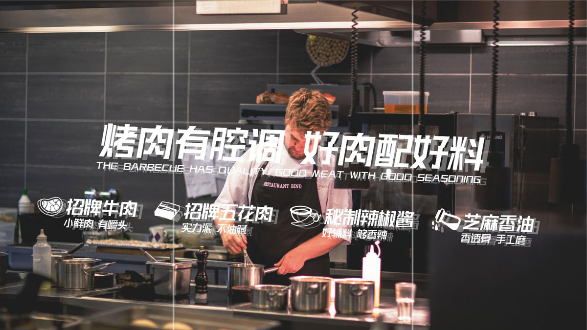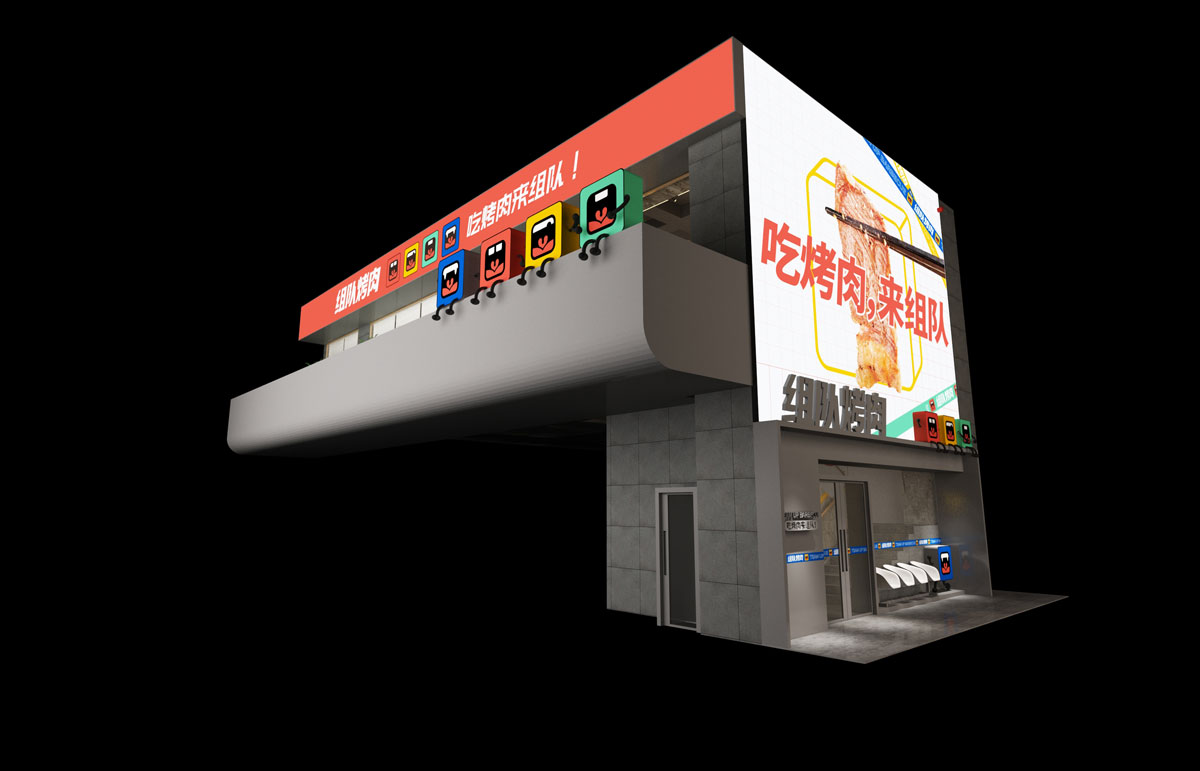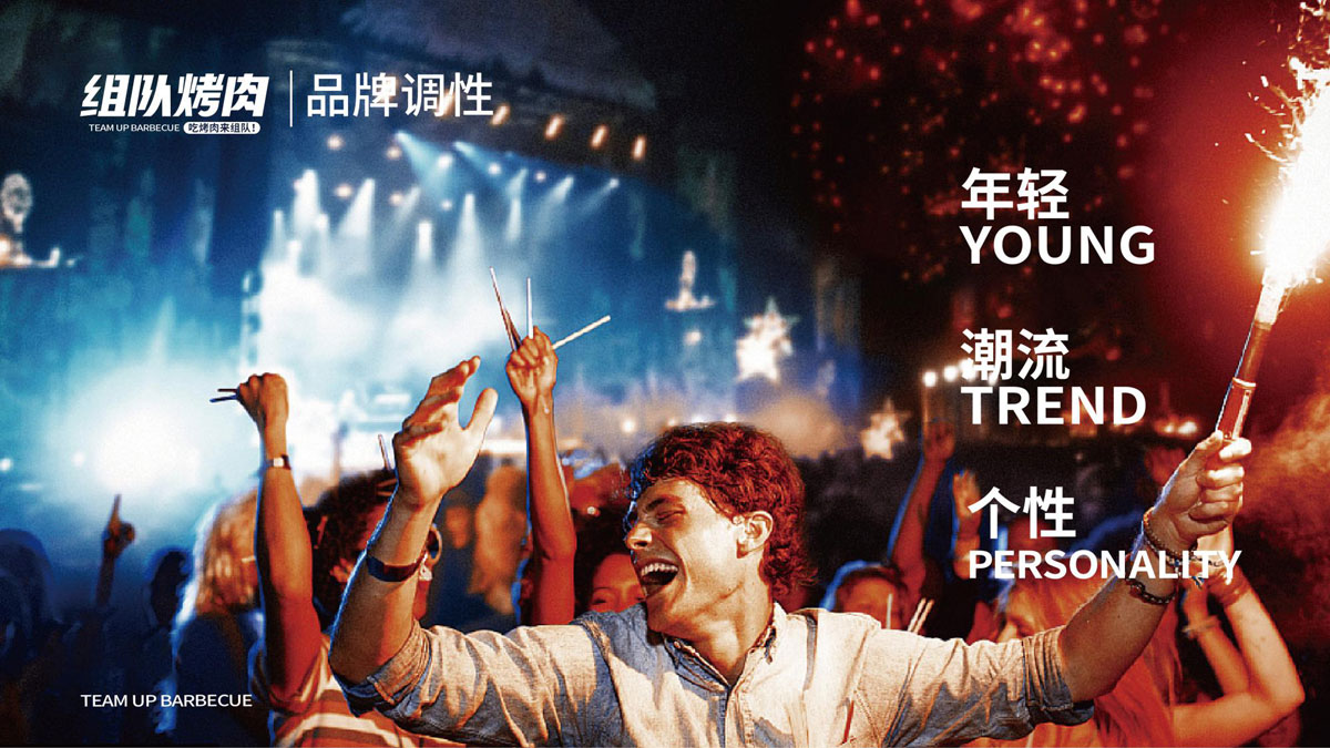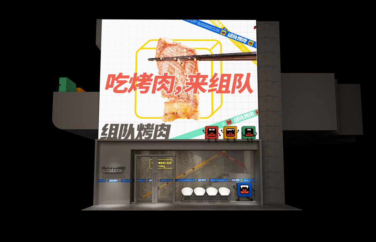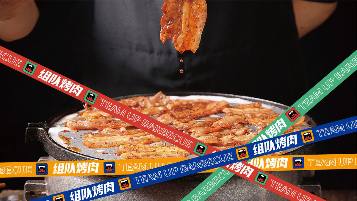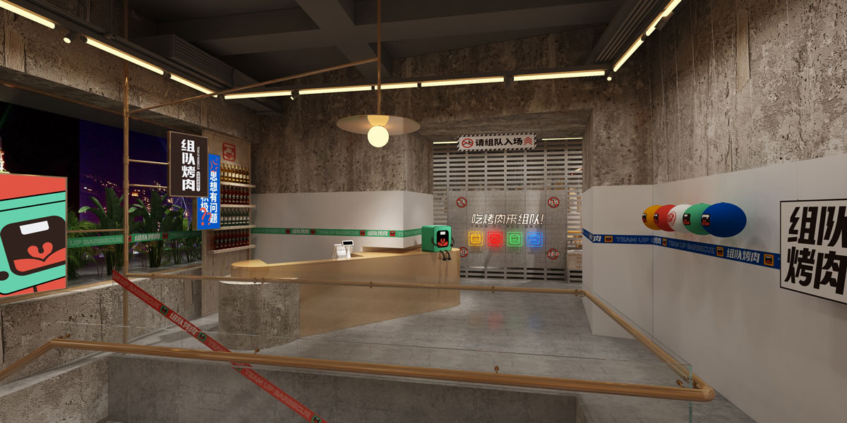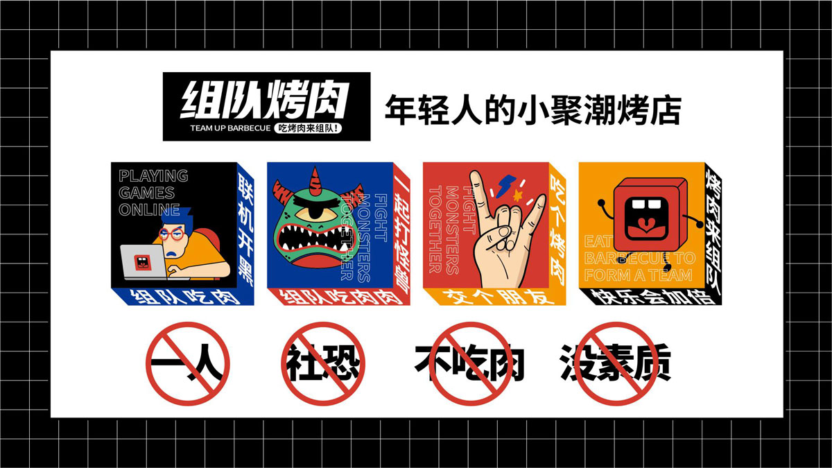 根據(jù)對(duì)湖南本地烤肉品牌的考察,確定組隊(duì)烤肉以年輕群體社交場(chǎng)景為定位方向,主打年輕潮流文化。提煉出品牌塑造的三個(gè)關(guān)鍵詞:年輕、潮流、小聚,打出“吃烤肉,來(lái)組隊(duì)”的超級(jí)口號(hào)??臻g及品牌設(shè)計(jì)以五花紅,潮藍(lán)為主色調(diào),在空間設(shè)計(jì)中體現(xiàn)時(shí)下潮流用語(yǔ),更貼近年輕人的生活語(yǔ)境,讓客戶在用餐時(shí)能對(duì)品牌有會(huì)心一笑的認(rèn)同感。從而實(shí)現(xiàn)超級(jí)口號(hào)的可持續(xù)性傳播。