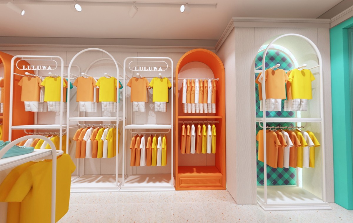 以簡約時尚的孔雀綠與愛馬仕橙作為視覺主基調(diào),跳躍的色彩帶來活力滿滿的空間氛圍。大面積的孔雀藍(lán)與石膏線組成外部門面形象,清新大氣更具視覺吸引力;打造情景櫥窗展示,對品牌經(jīng)營內(nèi)容進(jìn)行清晰展示,同時也隔斷外部視線,一眼看去門面形象極具舒適簡約感。 而內(nèi)部鏤空的置物架則有增加空間通透感作用,同時滿足視覺美觀與產(chǎn)品收納上的需求;拱形的收銀臺背景與圓弧的懸衣架相互呼應(yīng),更添一分童稚的趣味感。